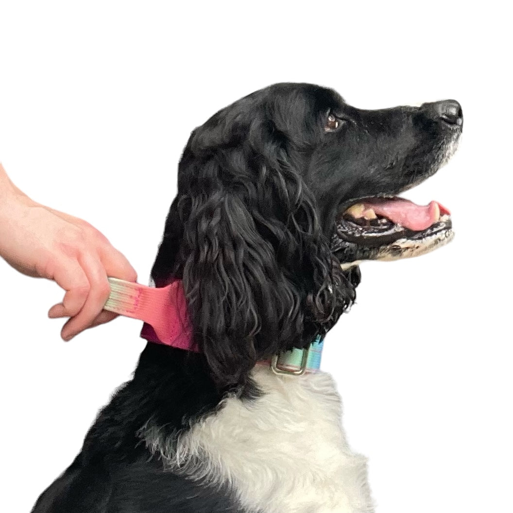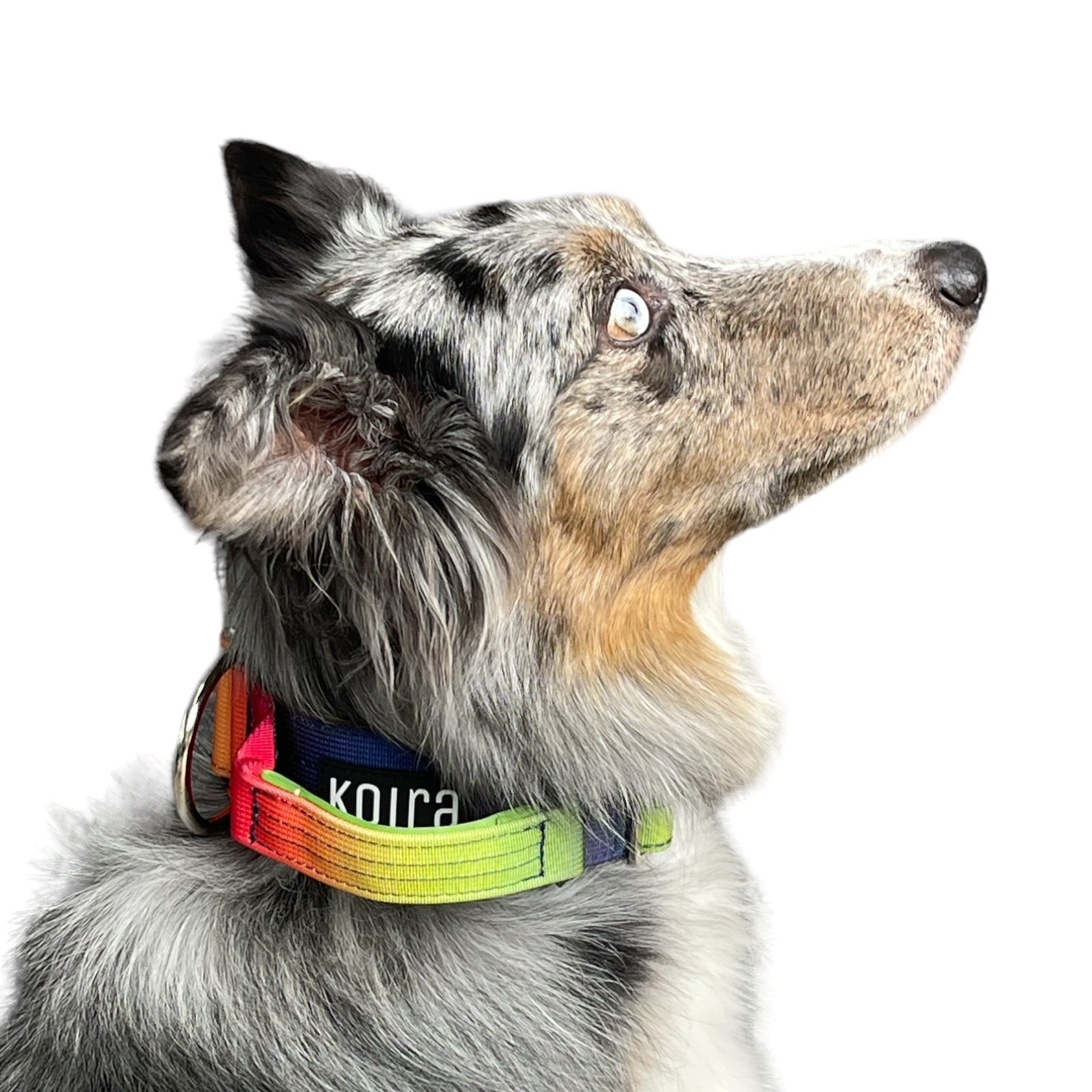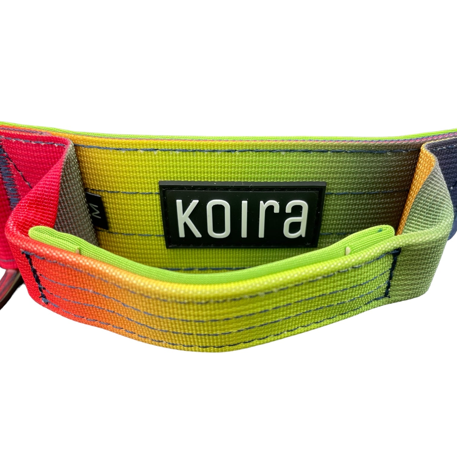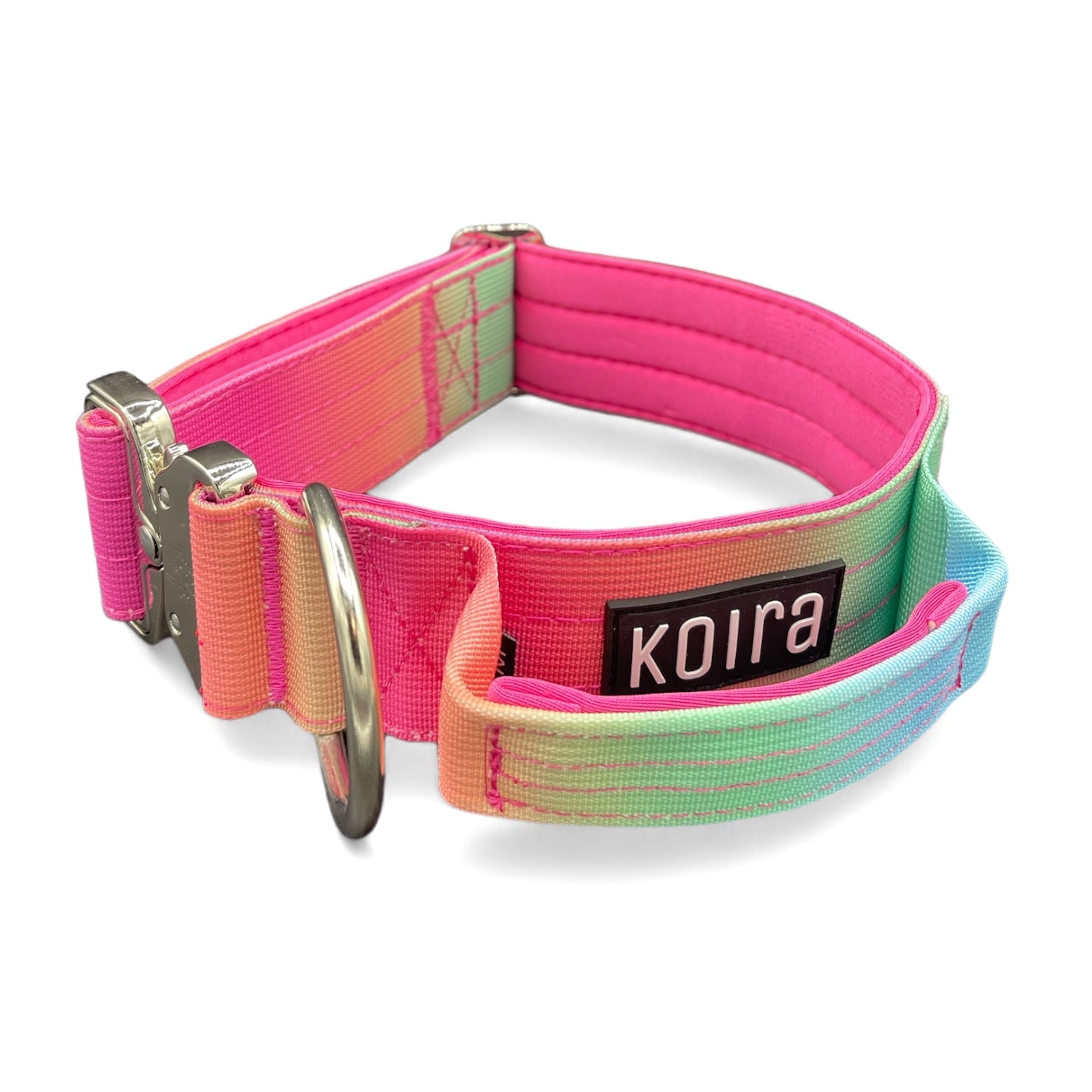 Enhance your dog's style and functionality with the Koira Pastel Rainbow Gradient Tactical Dog Collar. This vibrant and durable collar features a stunning pastel rainbow gradient design, making your dog stand out. Built for strength and versatility, this collar is perfect for active dogs. An added handle provides extra control during training and outdoor adventures.