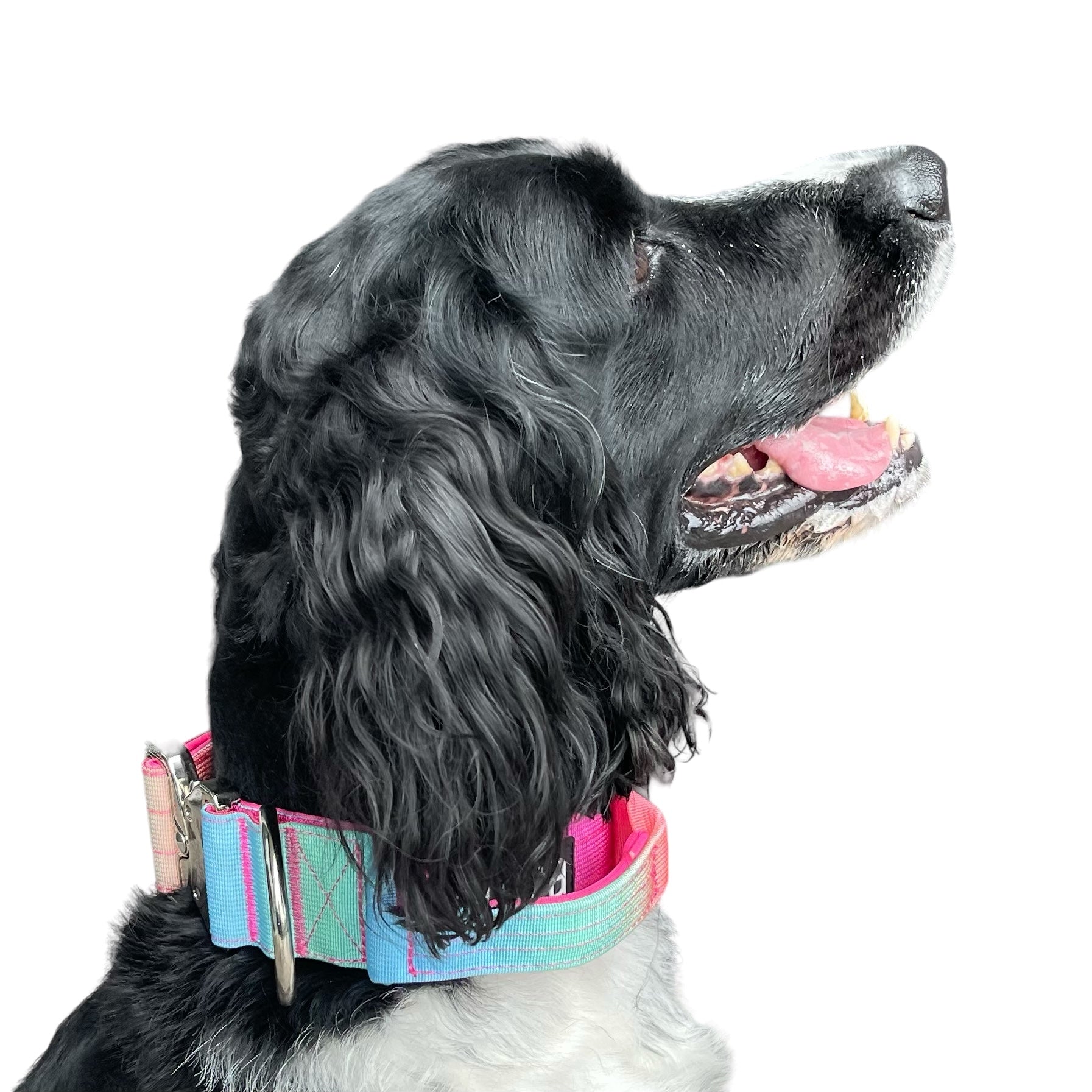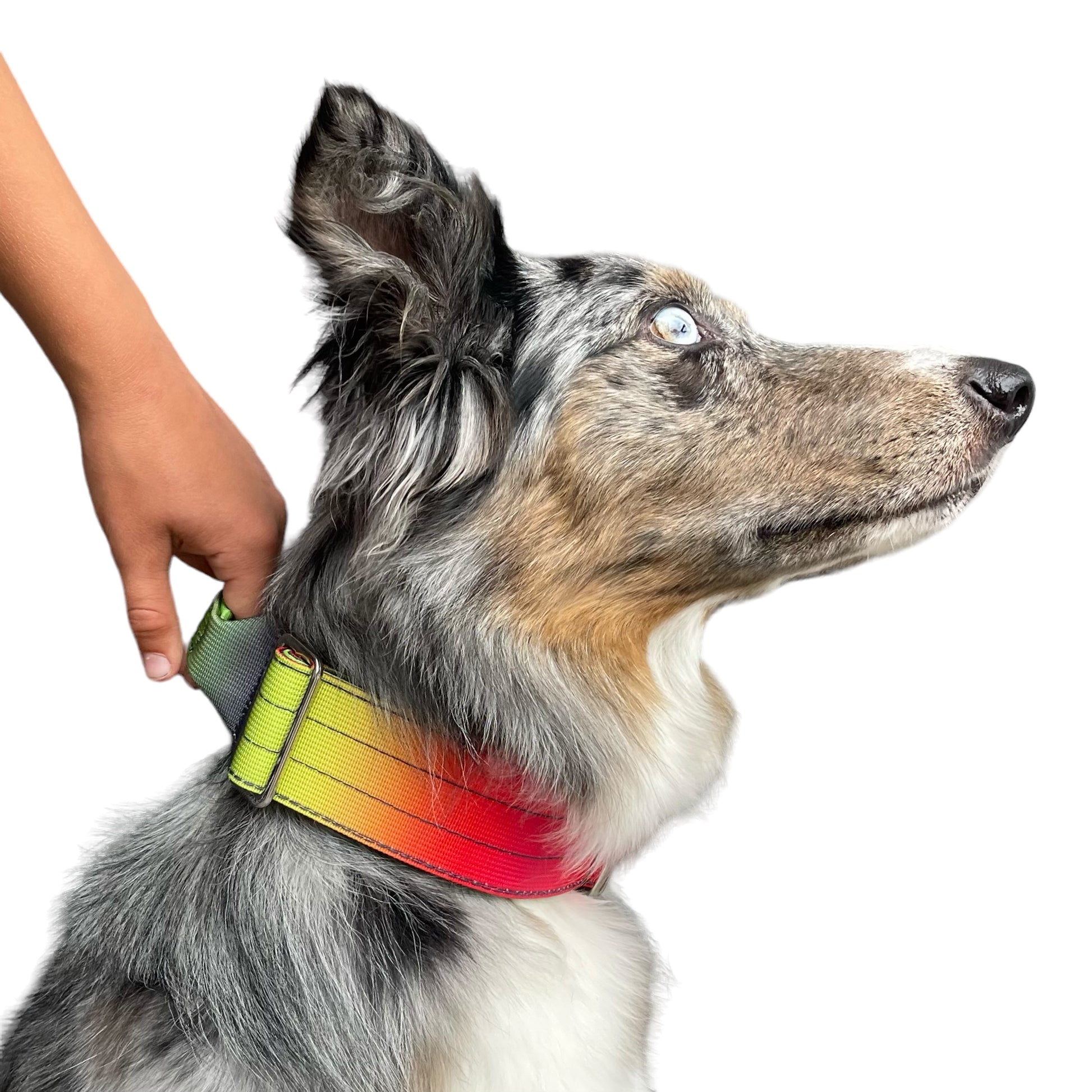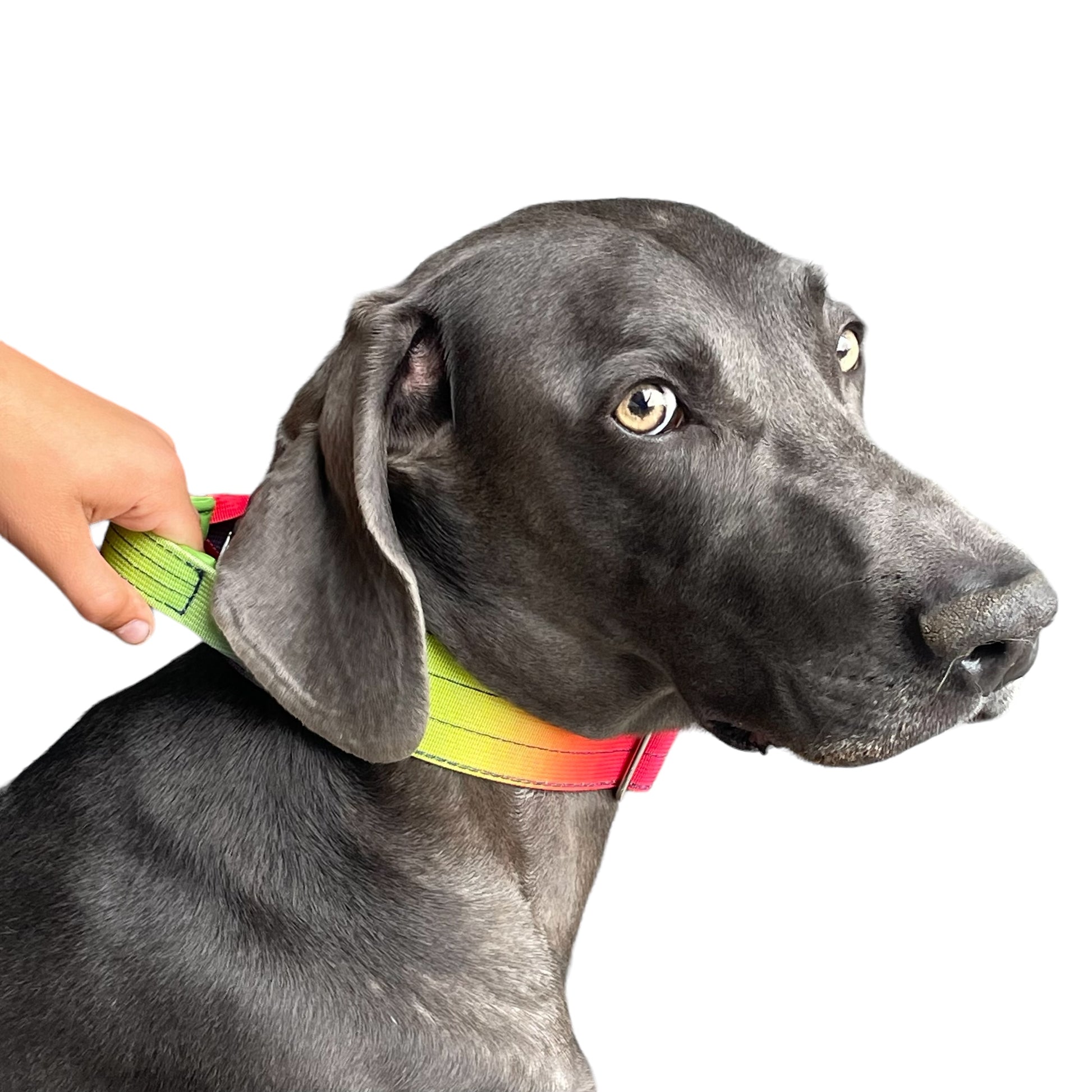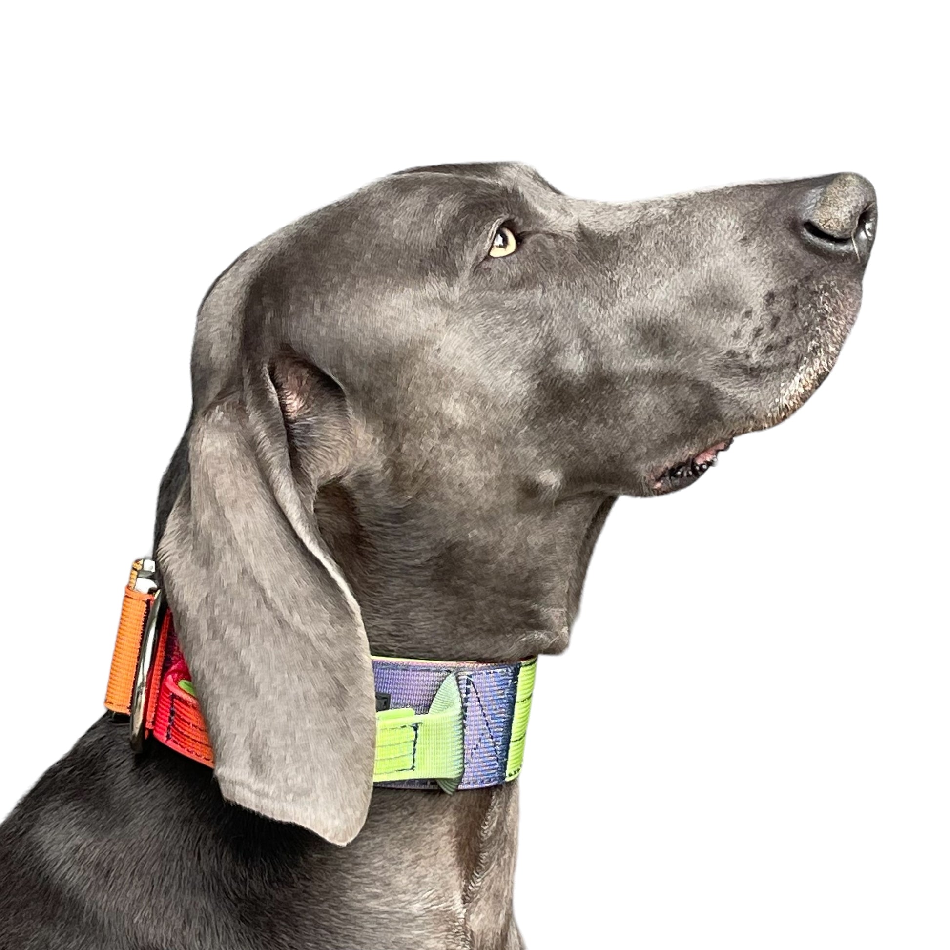 Enhance your dog's style and functionality with the Koira Pastel Rainbow Gradient Tactical Dog Collar. This vibrant and durable collar features a stunning pastel rainbow gradient design, making your dog stand out. Built for strength and versatility, this collar is perfect for active dogs. An added handle provides extra control during training and outdoor adventures.