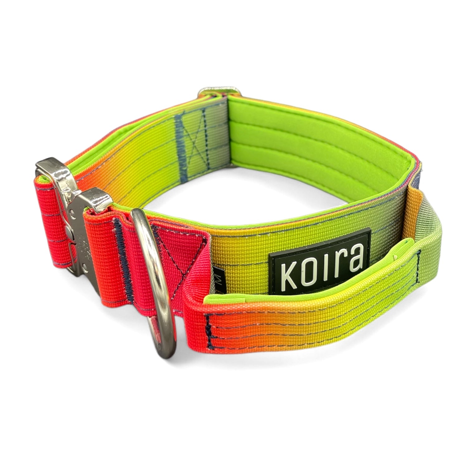 Enhance your dog's style and functionality with the Koira Rainbow Gradient Tactical Dog Collar. This vibrant and durable collar features a stunning rainbow gradient design, making your dog stand out. Built for strength and versatility, this collar is perfect for active dogs. An added handle provides extra control during training and outdoor adventures.