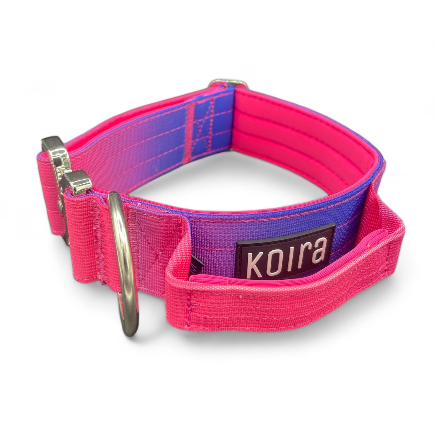Enhance your dog's style and functionality with the Koira Pink to Purple Gradient Tactical Dog Collar. This vibrant and durable collar features a stunning gradient design, making your dog stand out. Built for strength and versatility, this collar is perfect for active dogs. An added handle provides extra control during training and outdoor adventures.